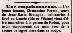 « Mon fils Jean-Marie allait souvent au village de Pussac en Tresboeuf chez Jean-Marie Gaigeard, frère de mon second époux. Il connut ainsi la famille Perrin qui habitait le même village » (Julienne Brard) Cherchant l’âme sœur mais « peu hardi et causant peu », Jean-Marie considère avec intérêt le conseil du fils Perrin : l’une des sœurs serait peut-être … Lire la suite de 2- L’empoisonneuse d’Ércé-en-Lamée. La rencontre, les accordailles